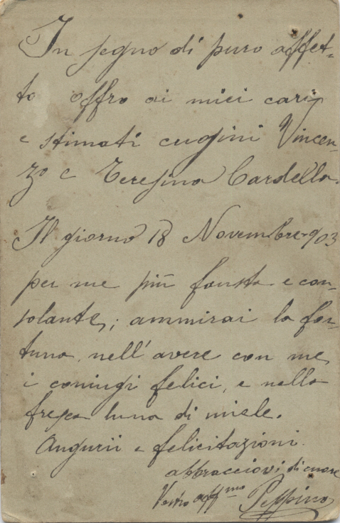 "In pegno di puro affetto offro ai miei cari e stimati cugini, Vincenzo e Teresina Cardella. Il giorno 18 Novembre 1903, per me piú fausto e consolante,